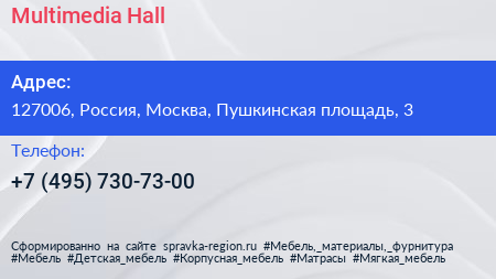 Multimedia Hall по адресу 127006, Россия, Москва, Пушкинская площадь, 3 в дальнейшем Организация, размещена в следующих категориях: