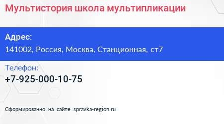 Мультистория, школа мультипликации по адресу 141002, Россия, Москва, Станционная, ст7 в дальнейшем Организация, размещена в следующих категориях: