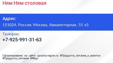 Ням-Ням, столовая по адресу 111024, Россия, Москва, Авиамоторная, 55 к5 в дальнейшем Организация, размещена в следующих категориях: