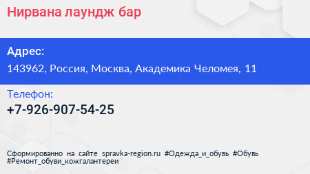 Нирвана, лаундж-бар по адресу 143962, Россия, Москва, Академика Челомея, 11 в дальнейшем Организация, размещена в следующих категориях: