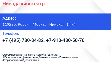 Нивада, кинотеатр по адресу 119285, Россия, Москва, Минская, 1г к4 в дальнейшем Организация, размещена в следующих категориях:
