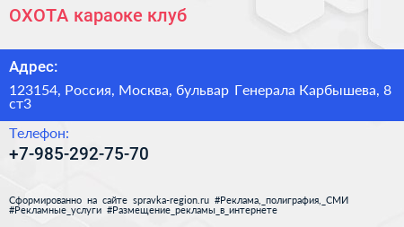 ОХОТА, караоке-клуб по адресу 123154, Россия, Москва, бульвар Генерала Карбышева, 8 ст3 в дальнейшем Организация, размещена в следующих категориях:
