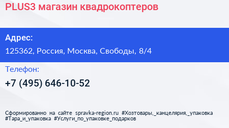 PLUS3, магазин квадрокоптеров по адресу 125362, Россия, Москва, Свободы, 8/4 в дальнейшем Организация, размещена в следующих категориях: