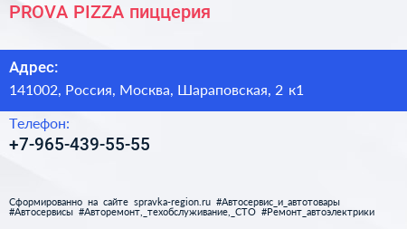 PROVA PIZZA, пиццерия по адресу 141002, Россия, Москва, Шараповская, 2 к1 в дальнейшем Организация, размещена в следующих категориях:
