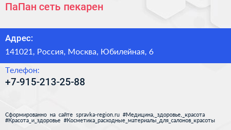 ПаПан, сеть пекарен по адресу 141021, Россия, Москва, Юбилейная, 6 в дальнейшем Организация, размещена в следующих категориях: