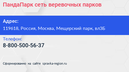 ПандаПарк, сеть веревочных парков по адресу 119618, Россия, Москва, Мещерский парк, вл3Б в дальнейшем Организация, размещена в следующих категориях: