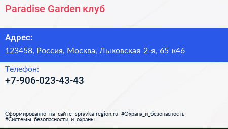 Paradise Garden, клуб по адресу 123458, Россия, Москва, Лыковская 2-я, 65 к46 в дальнейшем Организация, размещена в следующих категориях: