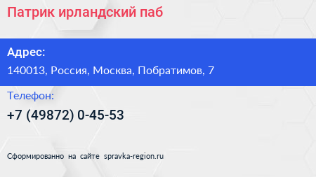 Патрик, ирландский паб по адресу 140013, Россия, Москва, Побратимов, 7 в дальнейшем Организация, размещена в следующих категориях: