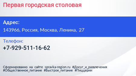 Первая городская столовая по адресу 143966, Россия, Москва, Ленина, 27 в дальнейшем Организация, размещена в следующих категориях: