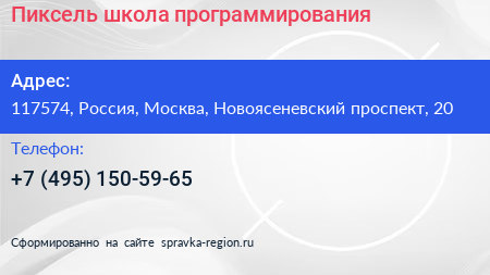Пиксель, школа программирования по адресу 117574, Россия, Москва, Новоясеневский проспект, 20 в дальнейшем Организация, размещена в следующих категориях: