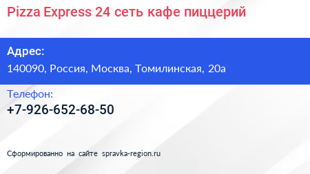 Pizza Express 24, сеть кафе-пиццерий по адресу 140090, Россия, Москва, Томилинская, 20а в дальнейшем Организация, размещена в следующих категориях: