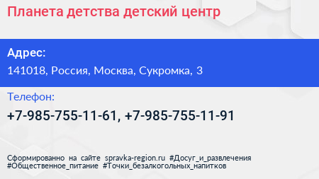 Планета детства, детский центр по адресу 141018, Россия, Москва, Сукромка, 3 в дальнейшем Организация, размещена в следующих категориях: