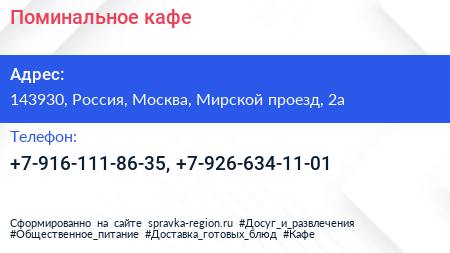 Поминальное кафе по адресу 143930, Россия, Москва, Мирской проезд, 2а в дальнейшем Организация, размещена в следующих категориях:
