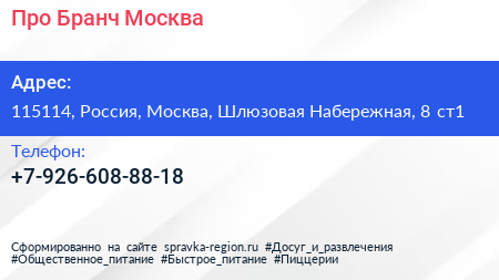Про Бранч Москва по адресу 115114, Россия, Москва, Шлюзовая Набережная, 8 ст1 в дальнейшем Организация, размещена в следующих категориях: