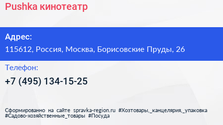 Pushka, кинотеатр по адресу 115612, Россия, Москва, Борисовские Пруды, 26 в дальнейшем Организация, размещена в следующих категориях: