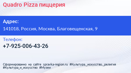 Quadro Pizza, пиццерия по адресу 141018, Россия, Москва, Благовещенская, 9 в дальнейшем Организация, размещена в следующих категориях: