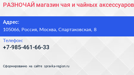 РАЗНОЧАЙ, магазин чая и чайных аксессуаров по адресу 105066, Россия, Москва, Спартаковская, 8 в дальнейшем Организация, размещена в следующих категориях: