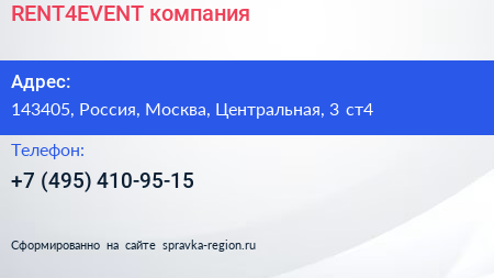 RENT4EVENT, компания по адресу 143405, Россия, Москва, Центральная, 3 ст4 в дальнейшем Организация, размещена в следующих категориях: