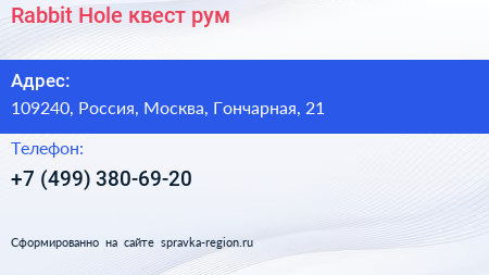 Rabbit Hole, квест-рум по адресу 109240, Россия, Москва, Гончарная, 21 в дальнейшем Организация, размещена в следующих категориях:
