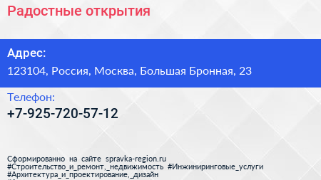 Радостные открытия по адресу 123104, Россия, Москва, Большая Бронная, 23 в дальнейшем Организация, размещена в следующих категориях: