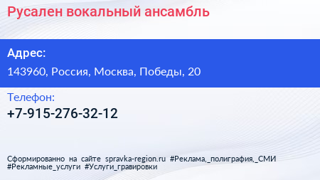 Русален, вокальный ансамбль по адресу 143960, Россия, Москва, Победы, 20 в дальнейшем Организация, размещена в следующих категориях: