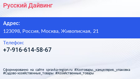 Русский Дайвинг по адресу 123098, Россия, Москва, Живописная, 21 в дальнейшем Организация, размещена в следующих категориях:
