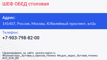 ШЕФ-ОБЕД, столовая по адресу 141407, Россия, Москва, Юбилейный проспект, вл3а в дальнейшем Организация, размещена в следующих категориях: