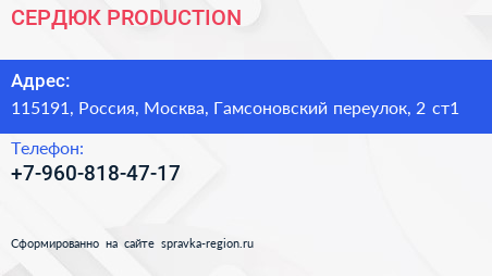 СЕРДЮК PRODUCTION по адресу 115191, Россия, Москва, Гамсоновский переулок, 2 ст1 в дальнейшем Организация, размещена в следующих категориях: