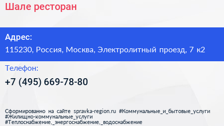 Шале, ресторан по адресу 115230, Россия, Москва, Электролитный проезд, 7 к2 в дальнейшем Организация, размещена в следующих категориях: