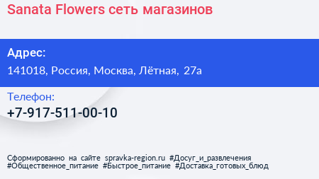Sanata Flowers, сеть магазинов по адресу 141018, Россия, Москва, Лётная, 27а в дальнейшем Организация, размещена в следующих категориях:
