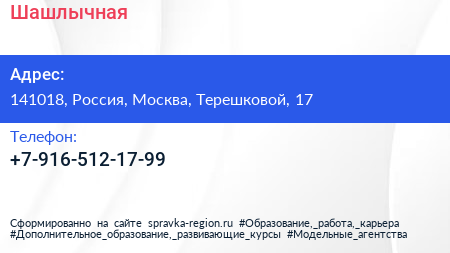 Шашлычная по адресу 141018, Россия, Москва, Терешковой, 17 в дальнейшем Организация, размещена в следующих категориях: