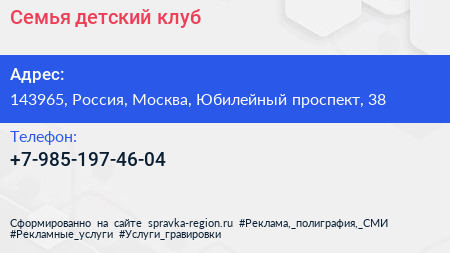 Семья, детский клуб по адресу 143965, Россия, Москва, Юбилейный проспект, 38 в дальнейшем Организация, размещена в следующих категориях: