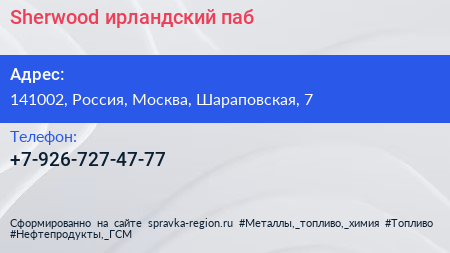 Sherwood, ирландский паб по адресу 141002, Россия, Москва, Шараповская, 7 в дальнейшем Организация, размещена в следующих категориях: