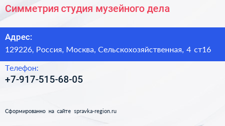 Симметрия, студия музейного дела по адресу 129226, Россия, Москва, Сельскохозяйственная, 4 ст16 в дальнейшем Организация, размещена в следующих категориях:
