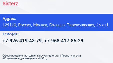 Sisterz по адресу 129110, Россия, Москва, Большая Переяславская, 46 ст1 в дальнейшем Организация, размещена в следующих категориях: