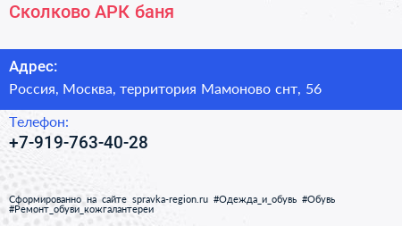 Сколково-АРК, баня по адресу Россия, Москва, территория Мамоново снт, 56 в дальнейшем Организация, размещена в следующих категориях: