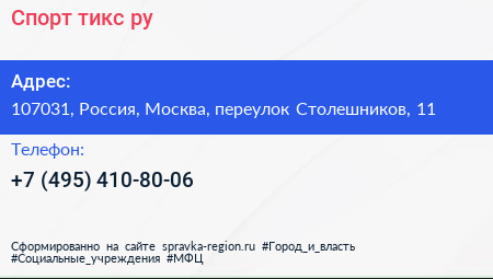Спорт-тикс.ру по адресу 107031, Россия, Москва, переулок Столешников, 11 в дальнейшем Организация, размещена в следующих категориях: