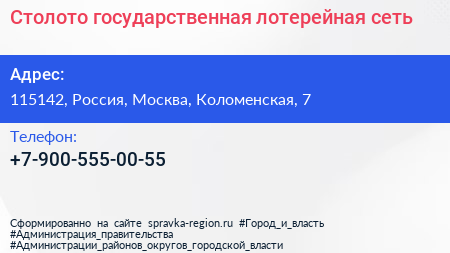 Столото, государственная лотерейная сеть по адресу 115142, Россия, Москва, Коломенская, 7 в дальнейшем Организация, размещена в следующих категориях: