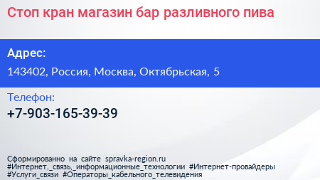 Стоп кран, магазин-бар разливного пива по адресу 143402, Россия, Москва, Октябрьская, 5 в дальнейшем Организация, размещена в следующих категориях: