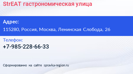 StrEAT, гастрономическая улица по адресу 115280, Россия, Москва, Ленинская Слобода, 26 в дальнейшем Организация, размещена в следующих категориях:
