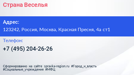 Страна Веселья по адресу 123242, Россия, Москва, Красная Пресня, 4а ст1 в дальнейшем Организация, размещена в следующих категориях:
