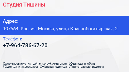 Студия Тишины по адресу 107564, Россия, Москва, улица Краснобогатырская, 2 в дальнейшем Организация, размещена в следующих категориях: