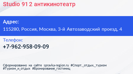 Studio 91/2, антикинотеатр по адресу 115280, Россия, Москва, 3-й Автозаводский проезд, 4 в дальнейшем Организация, размещена в следующих категориях: