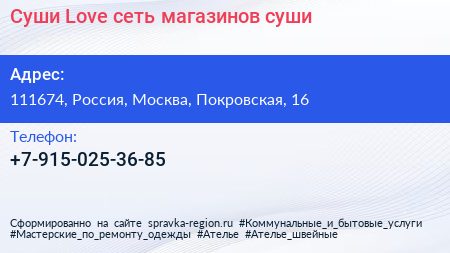 Суши Love, сеть магазинов суши по адресу 111674, Россия, Москва, Покровская, 16 в дальнейшем Организация, размещена в следующих категориях: