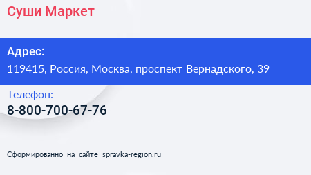 Суши-Маркет по адресу 119415, Россия, Москва, проспект Вернадского, 39 в дальнейшем Организация, размещена в следующих категориях: