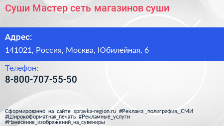 Суши Мастер, сеть магазинов суши по адресу 141021, Россия, Москва, Юбилейная, 6 в дальнейшем Организация, размещена в следующих категориях: