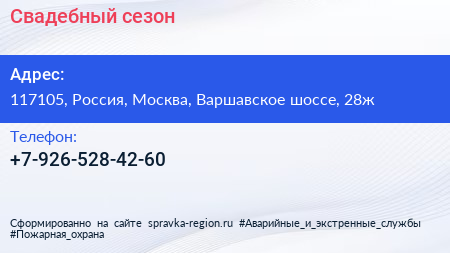 Свадебный сезон по адресу 117105, Россия, Москва, Варшавское шоссе, 28ж в дальнейшем Организация, размещена в следующих категориях: