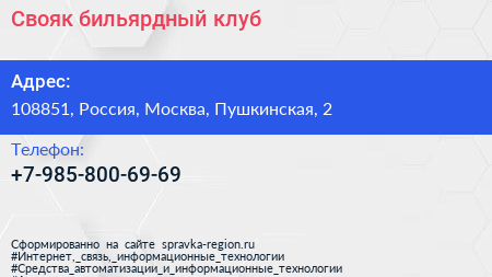 Свояк, бильярдный клуб по адресу 108851, Россия, Москва, Пушкинская, 2 в дальнейшем Организация, размещена в следующих категориях: