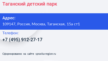 Таганский детский парк по адресу 109147, Россия, Москва, Таганская, 15а ст1 в дальнейшем Организация, размещена в следующих категориях:
