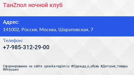 ТанZпол, ночной клуб по адресу 141002, Россия, Москва, Шараповская, 7 в дальнейшем Организация, размещена в следующих категориях: